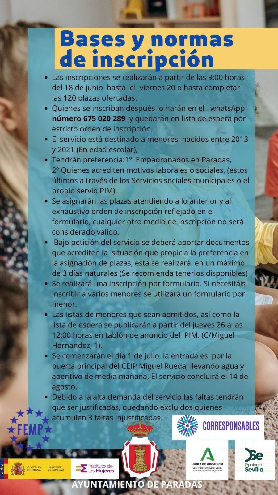 El Ayuntamiento de Paradas pone en marcha de nuevo este verano la Escuela de Verano para niños y niñas del municipio con edades comprendidas entre los tres y los doce años, en edad escolar, con el objetivo de facilitar la conciliación de la vida laboral y familiar y personal durante el periodo estival y esperando contribuir al bienestar de nuestros niñas y niñas y a un verano más divertido e igualitario.
