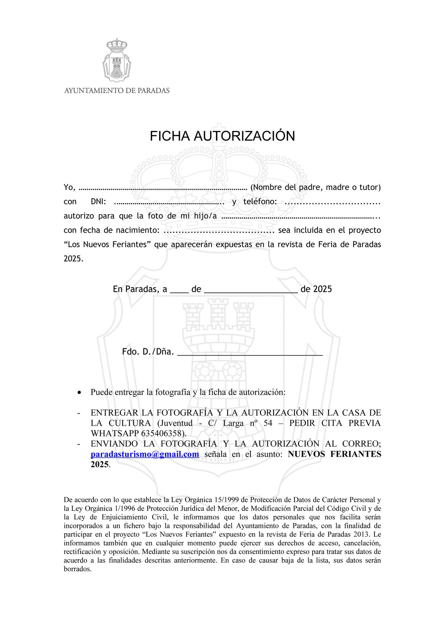 Hasta el 8 de abril se pueden entregar las fotos y autorizaciones en la Casa de la Cultura (pedir cita previa vía whattsapp al 635406358) o al correo paradasturismo@gmail.com