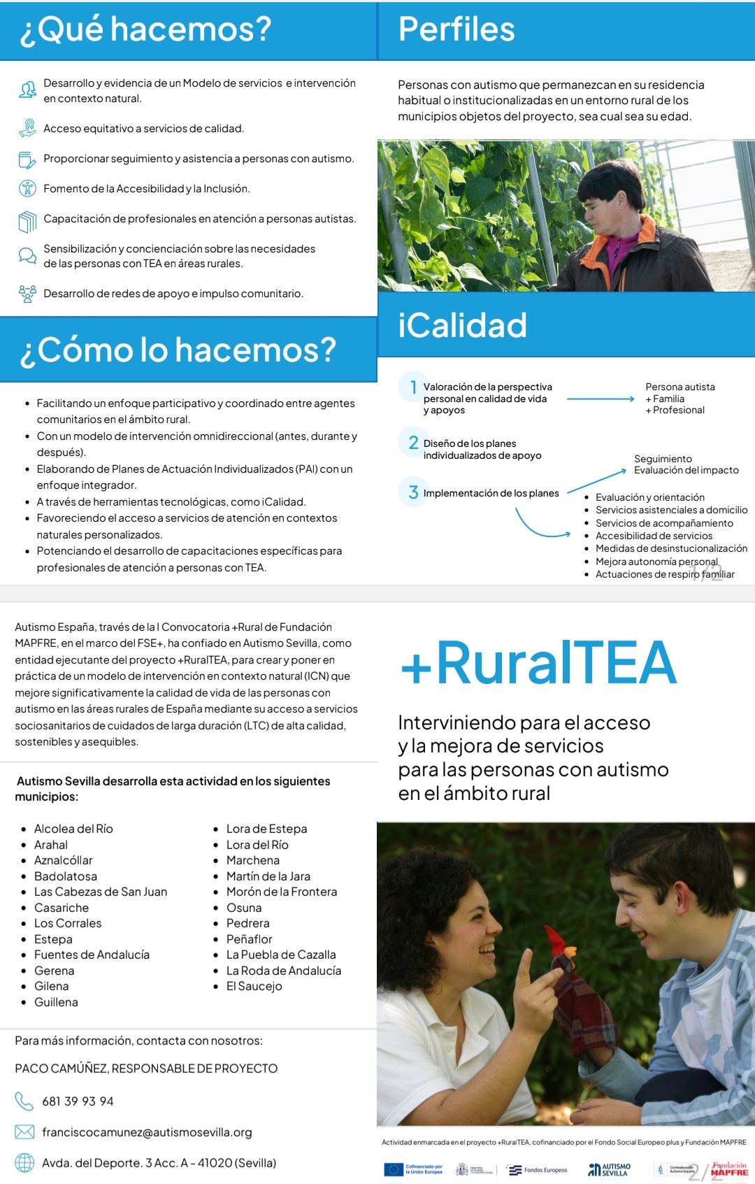 Con el objeto de mejorar la calidad de vida de las personas con autismo residentes en las áreas rurales de España, mediante su acceso a servicios sociosanitarios de cuidados de larga duración, nuestro municipio se suma al proyecto + RuralTEA, liderado por Autismo España y cofinanciado por el Fondo Social Europeo y la Fundación MAPFRE, que en la provincia de Sevilla está siendo desarrollado por Autismo Sevilla.