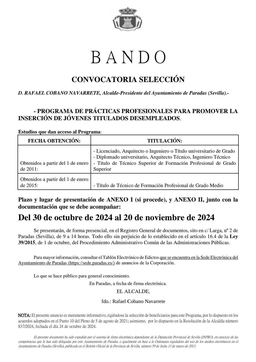 Para demandantes de empleo no ocupados de edades comprendidas entre 18 y 35 años o 45 años o más. Inscripciones a través de la App del SAE o en la máquina que se encuentra en la entrada del Ayuntamiento de Paradas.