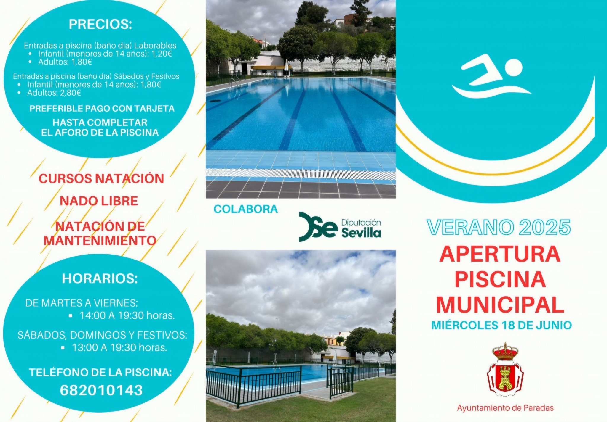 El miércoles 18 de junio se procederá a la apertura de la Piscina Municipal de Paradas. Los cursillos de natación, mantenimiento y nado libre tendrán lugar los meses de julio y agosto.La inscripción se realizará en el Aula Municipal de Cultura "La Comarcal" durante los días 24, 25, 26 y 30 de junio de 11:00 a 13:00 h.