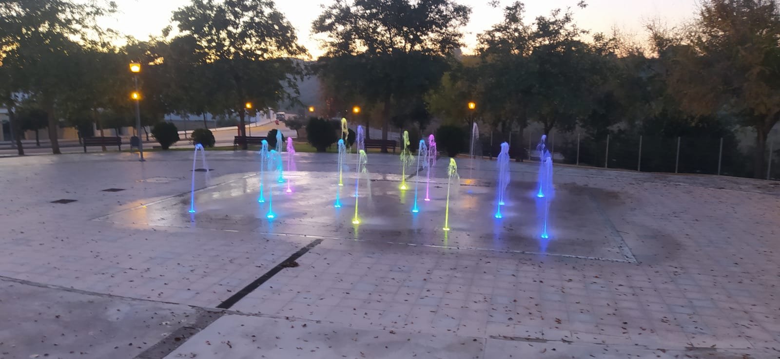 La fuente cuenta con un equipo de luces de colores que, al caer la noche, embellece la salida del agua, convirtiendo su funcionamiento en un bonito espectáculo. El dispositivo dispone además de un equipo de depuración de agua para la reutilización de la misma y de control de la altura de los chorros de agua. Un elemento, que contribuirá a refrescar los días calurosos en nuestro municipio.
