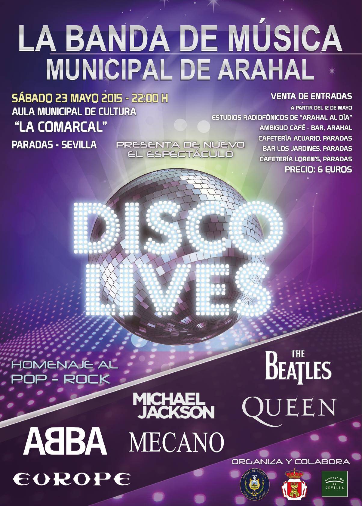 El próximo sábado 23 de Mayo a las 22:00 h. en Paradas, en el Aula Municipal de Cultura "La Comarcal" volveremos con el Especátulo Disco Lives, Homenaje al Pop Rock de los 60´s,70´s,80´s y 90´s.