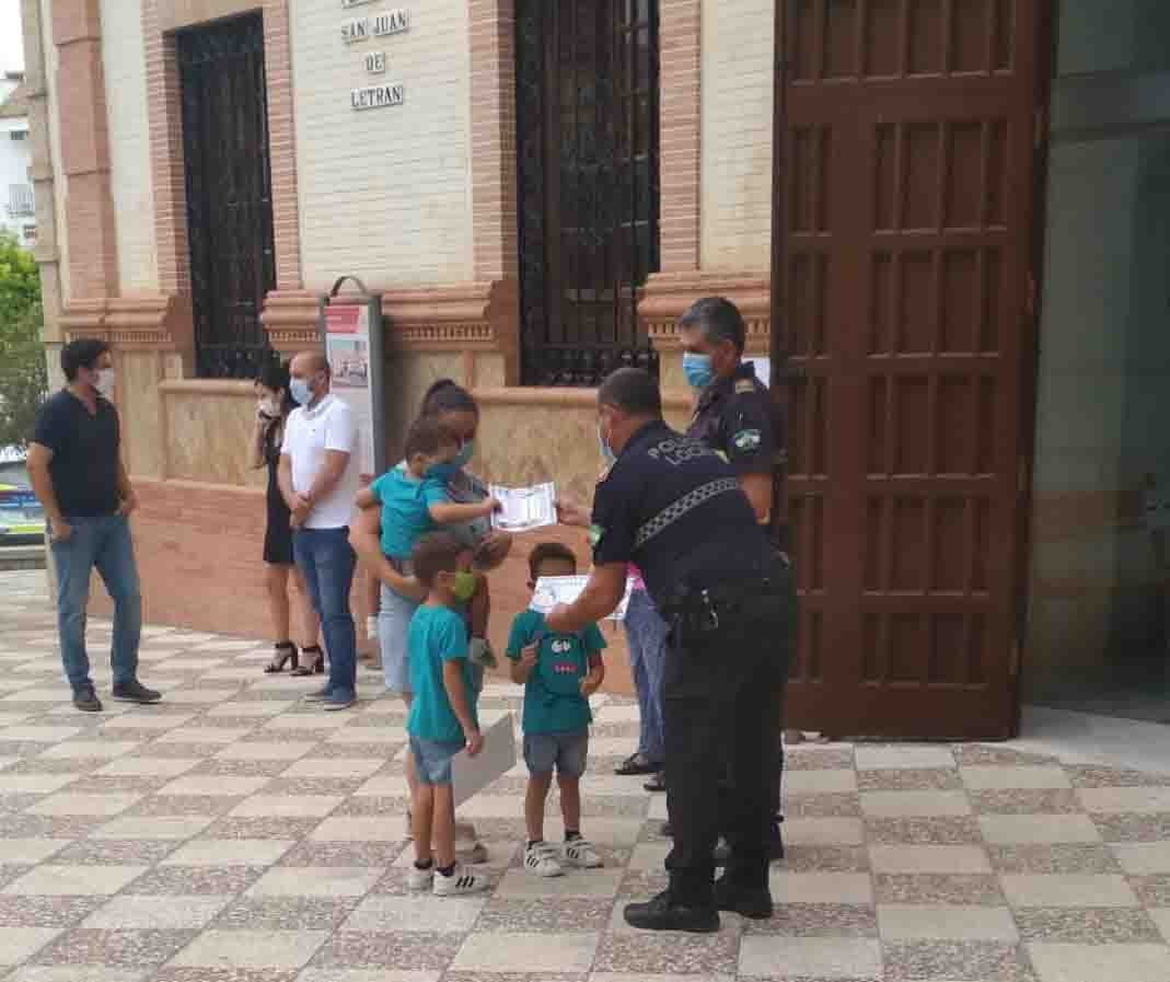Al aire libre, con sus marcarillas y guardando las distancias de seguridad, en la Plaza de San Juan de Letrán, y tras un pequeño discurso de agradecimiento del Sr. Alcalde, el Oficial Jefe de la Policía Local acompañado de uno de sus agentes, hicieron entrega personal de los diplomas a todos los niños que pudieron asistir al acto.