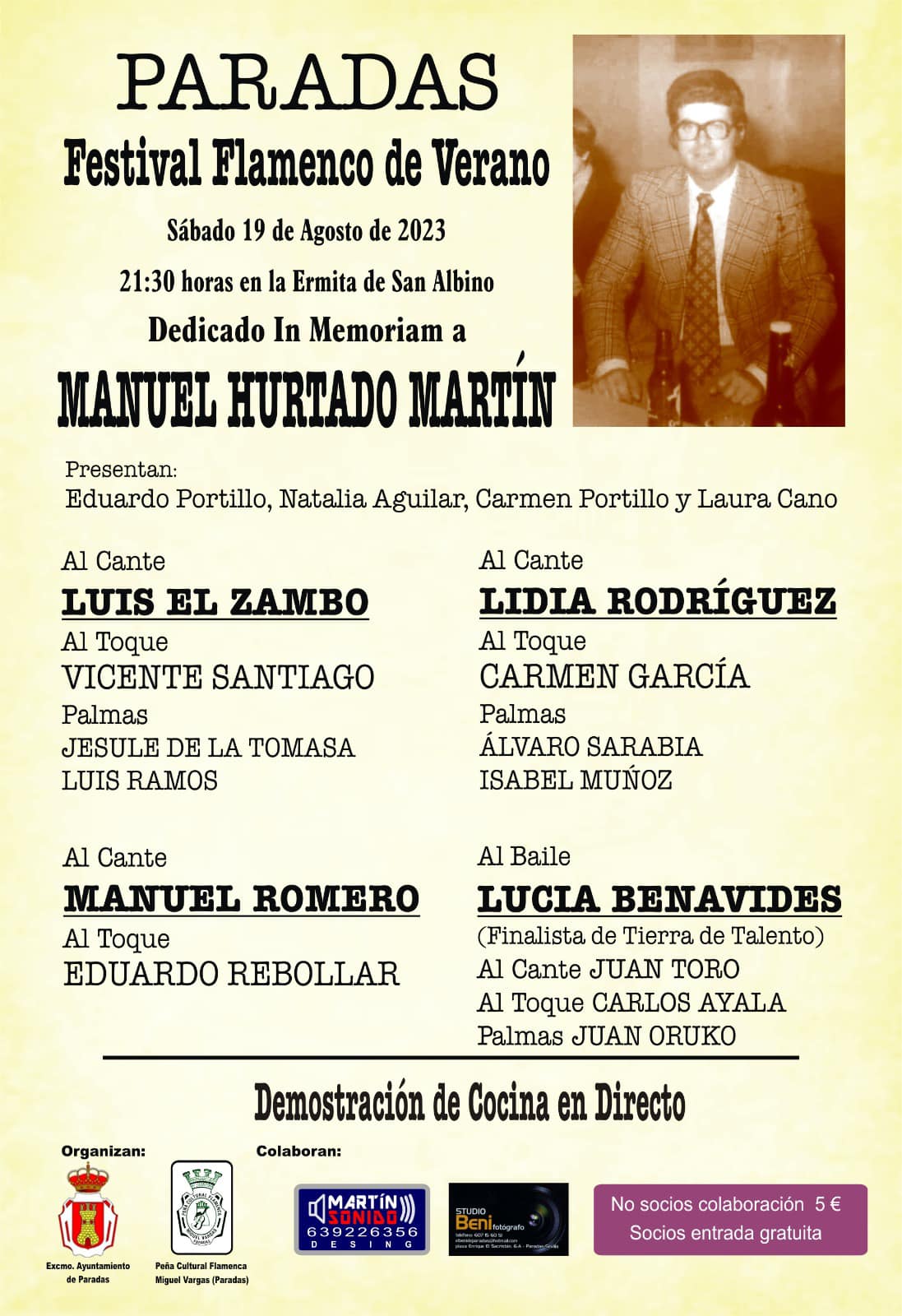 Se celebrará el próximo sábado 19 de agosto a las 9 y media de la noche en la ermita San Albino, y en esta ocasión estará dedicado In Memoriam a Manuel Hurtado Martín, por su trabajo y compromiso durante años con el flamenco y en especial con la Peña Flamenca Miguel Vargas. Siempre en nuestro recuerdo.