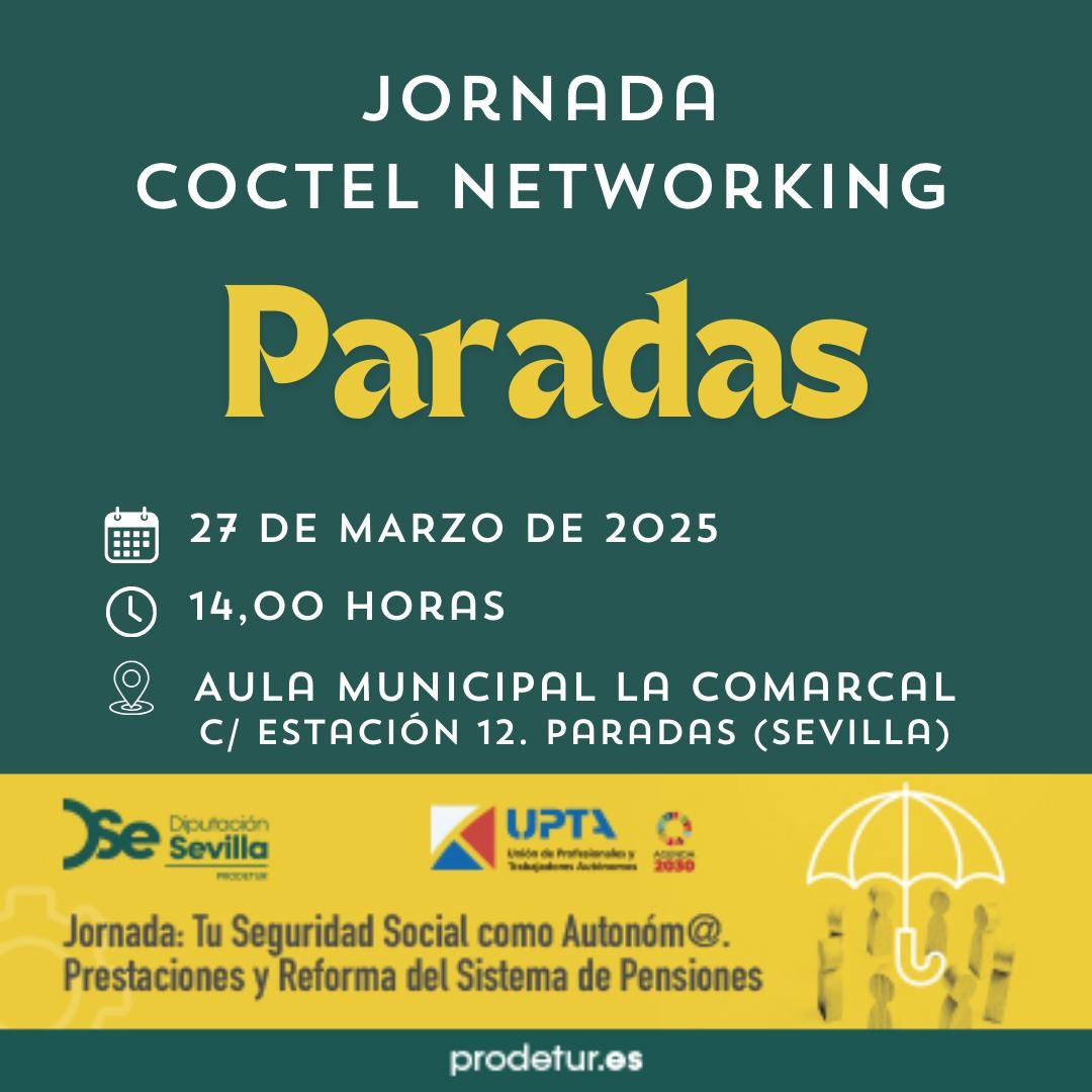 Prodetur, en colaboración con La Unión de Profesionales y Trabajadores Autónomos (UPTA) y el Ayuntamiento de Paradas, va a celebrar una Jornada sobre “Tu Seguridad Social como autónom@. Prestaciones y reforma del sistema de pensiones”.
