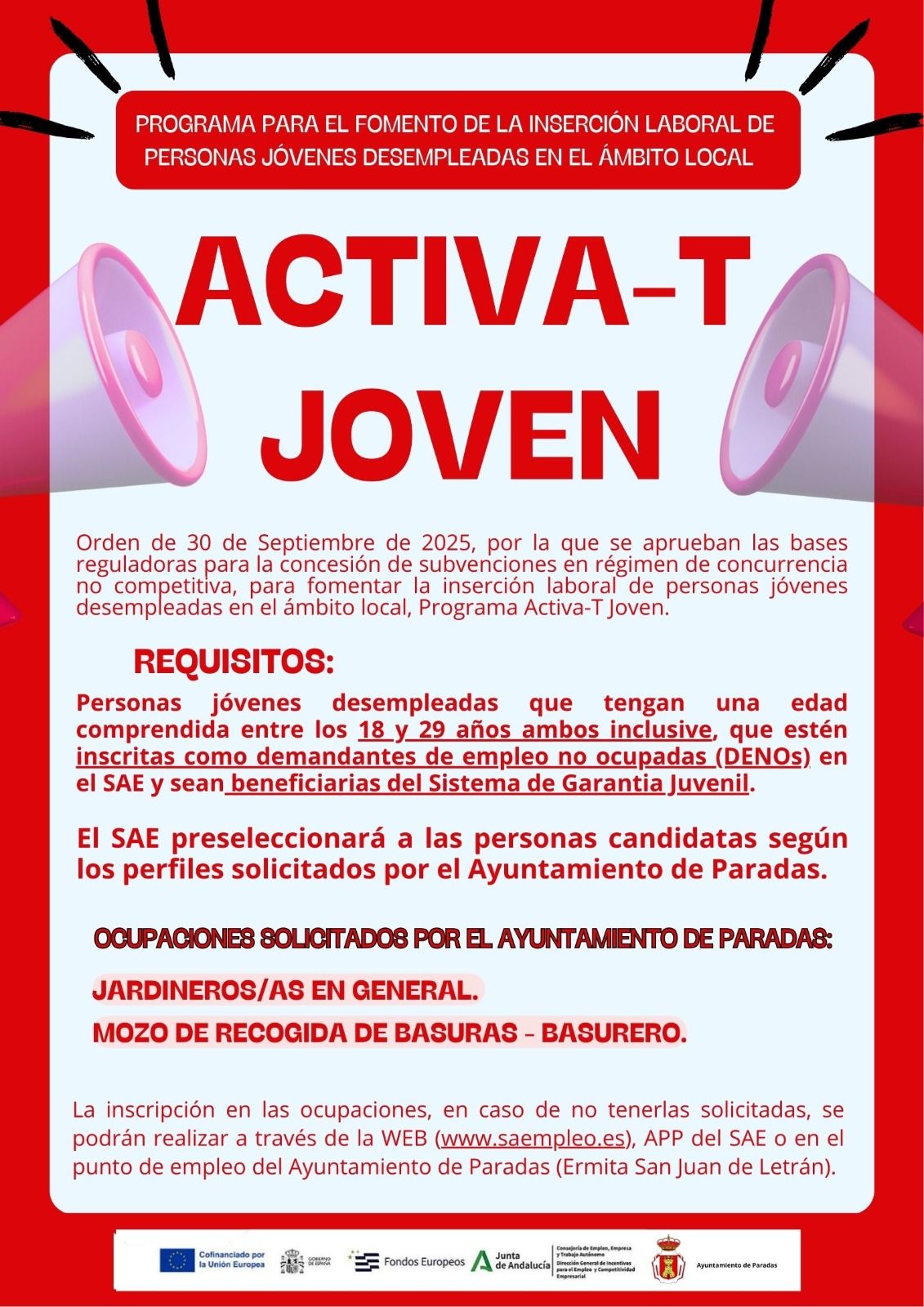 El Ayuntamiento de Paradas informa de la subvención del Programa Activa-T Joven 2025, destinada a mejorar la inserción laboral de jóvenes de 18 a 29 años inscritos en el Sistema Nacional de Garantía Juvenil.
