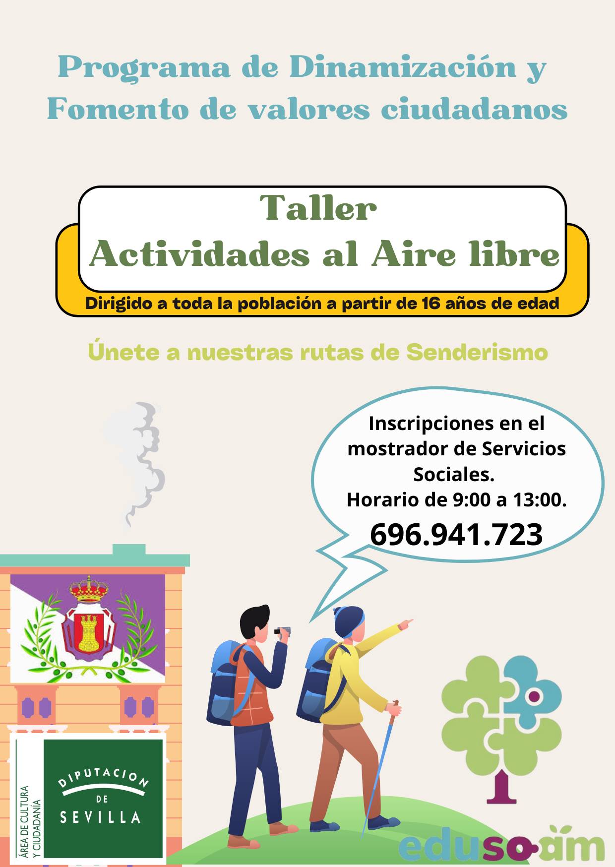 El Programa de Dinamización y Fomento de valores ciudadanos organiza rutas de senderismo dentro de sus talleres de actividades al aire libre, dirigido a toda la población a partir de 16 años de edad.